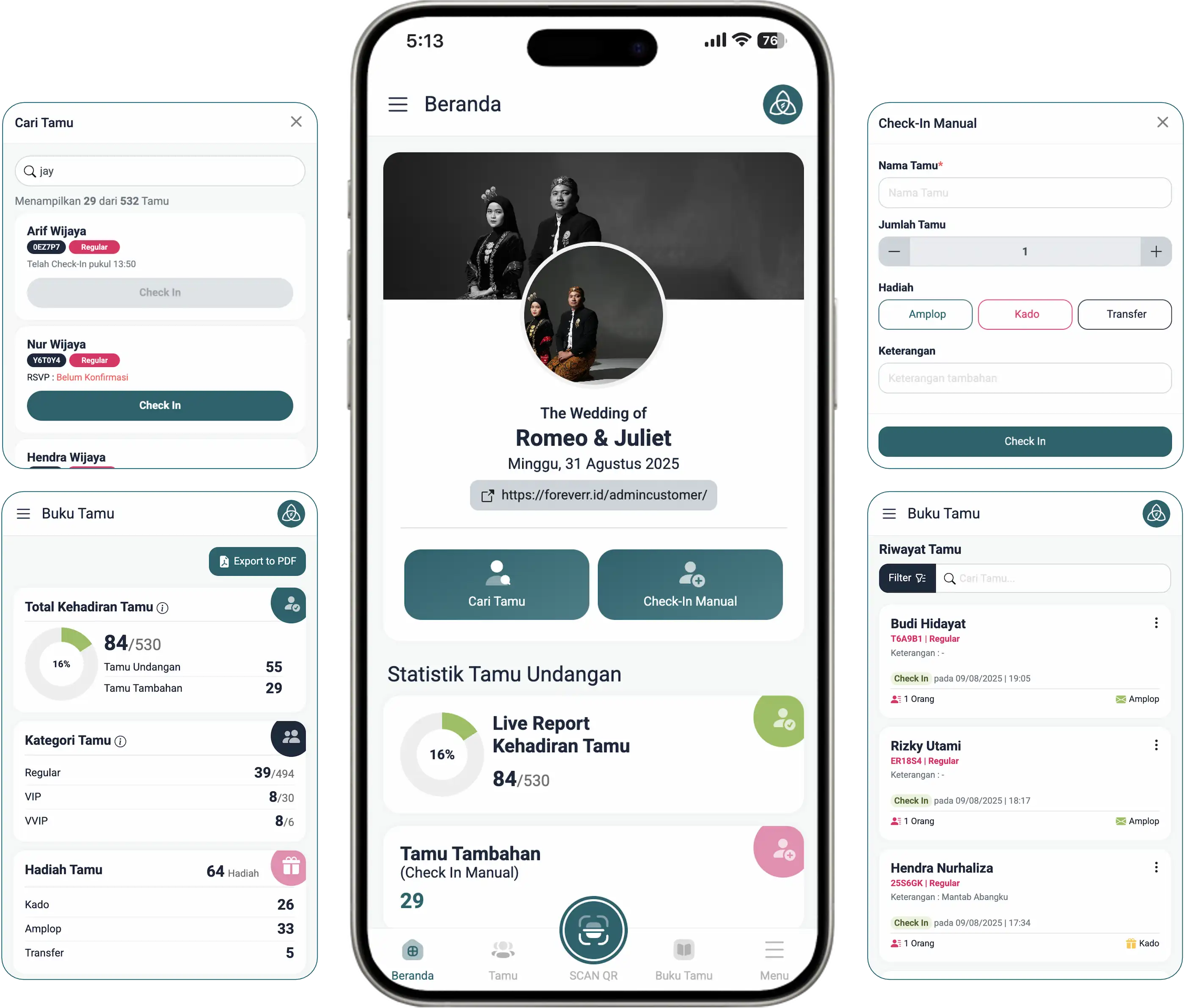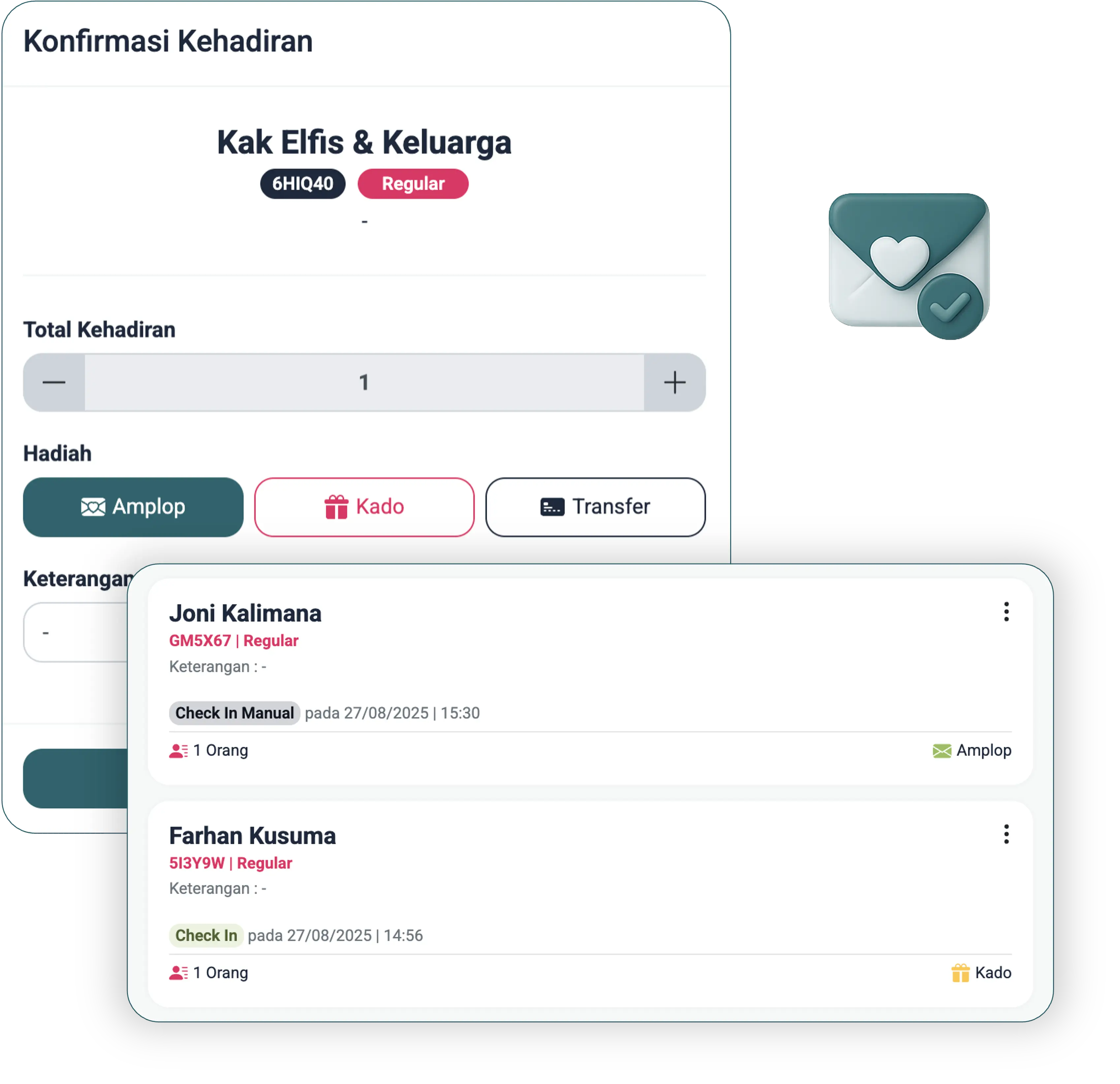 Setiap tamu istimewa. Dengan Aplikasi Penerima Tamu, masuk venue jadi sehalus senyuman: scan QR → terdata otomatis → lanjut menikmati acara, tanpa antre dan tanpa ribet.