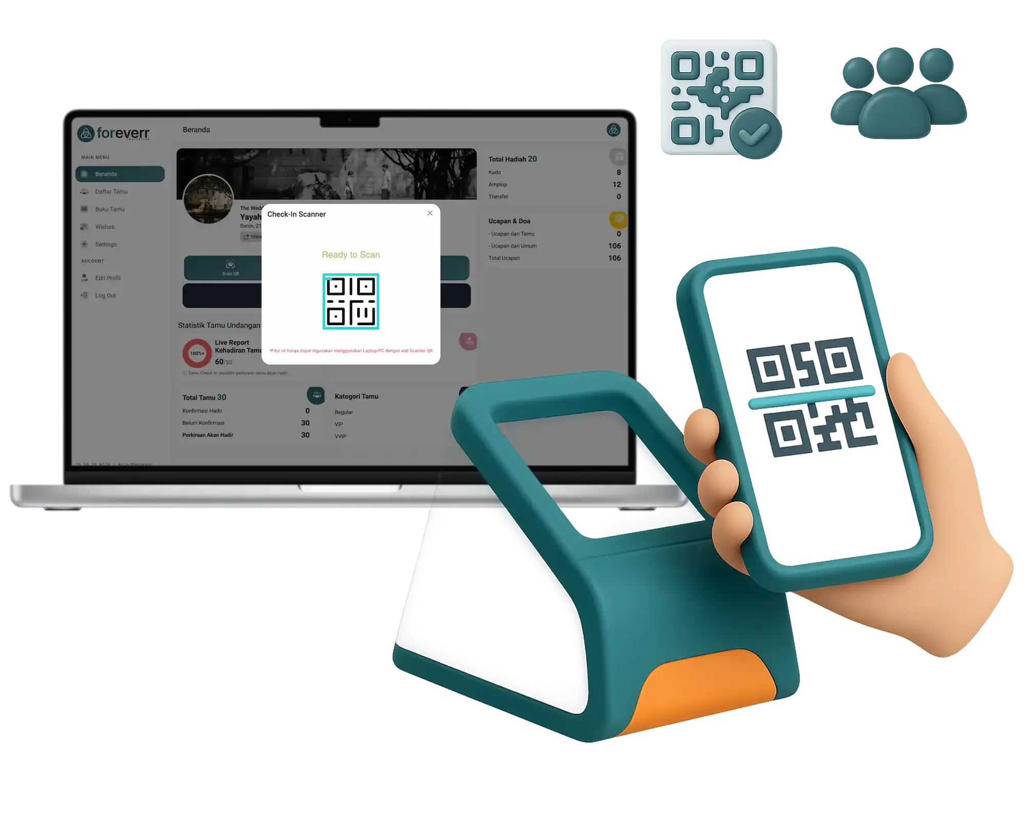 Solusi modern untuk penerimaan tamu yang cepat dan terorganisir. Cukup scan QR Code untuk registrasi dan layar sapa memberi sentuhan hangat bagi setiap tamu. Dilengkapi cetak label dan QR Code fisik, semua berjalan praktis dalam satu sistem.